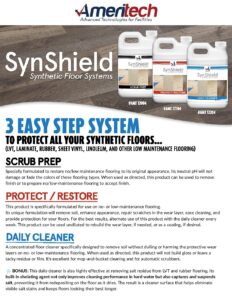 SynShield – Synthetic Floor Systems. To protect all your synthetic floors… LVT, Laminate, Rubber, Sheet Vinyl, Linoleum, and other Low Maintenance Flooring. Scrub prep. Protect / Restore. Daily Cleaner.